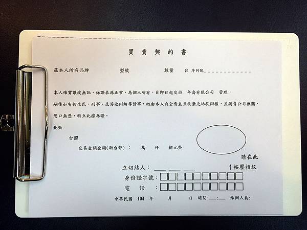 填完買賣契約書之後,會請您出示雙證件(身分證、駕照 or 健保卡),核對無誤後